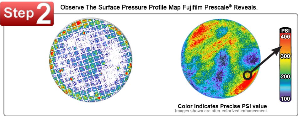 Have you ever needed to evaluate pressure or force between two touching or mating surfaces? Previously, your only alternatives were strain gauges and load cells, that are both time consuming and difficult to interface. Now with the advent of our disposable one-time use pressure film, Fujifilm Prescale®, evaluating surface contact pressure distribution and magnitude is accurate, quick and highly economical.
