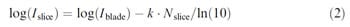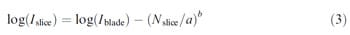 where Nslice is the number of slice (Nslice = 1,2,. . ., 20); Islice is the concentration (log cfu/cm2) on the slice Nslice; Iblade is a regression parameter (the intercept); and k/ln (10) is a regression parameter related to the slope through the calculation.