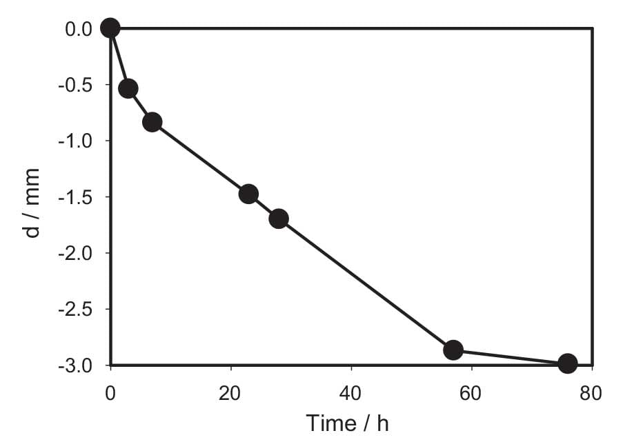 Fig. 6 shows variation of distance between the middle of lobes (Fig. 1c) with time in the presence of a sponge with gelatin in the trap. Experimental results obtained in twenty different traps on twenty different plants are very similar. During gelatin digestion by the Venus flytrap, the distance between lobes decreases because of compressing force increasing. Using the calibration dependence of force on thickness of a sponge shown in Fig. 3, it is possible to the measured distance into force during the gelatin digestion by the Venus flytrap (Fig. 7) using data from Figs. 3 and 6.
